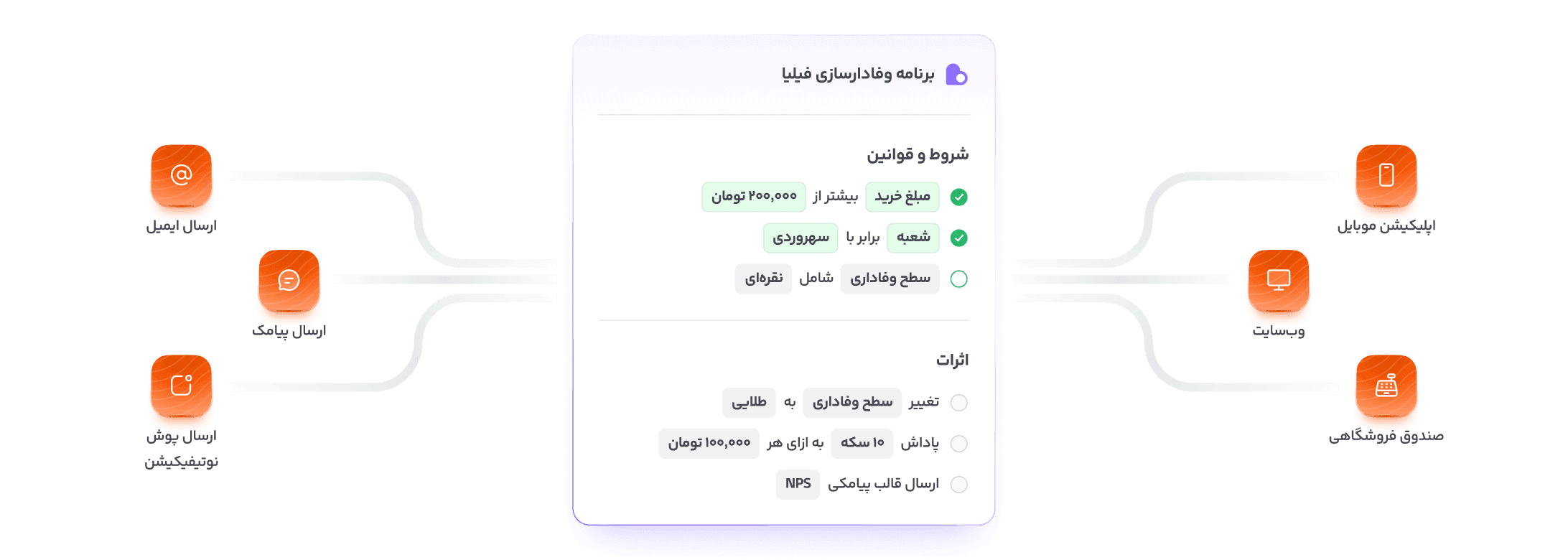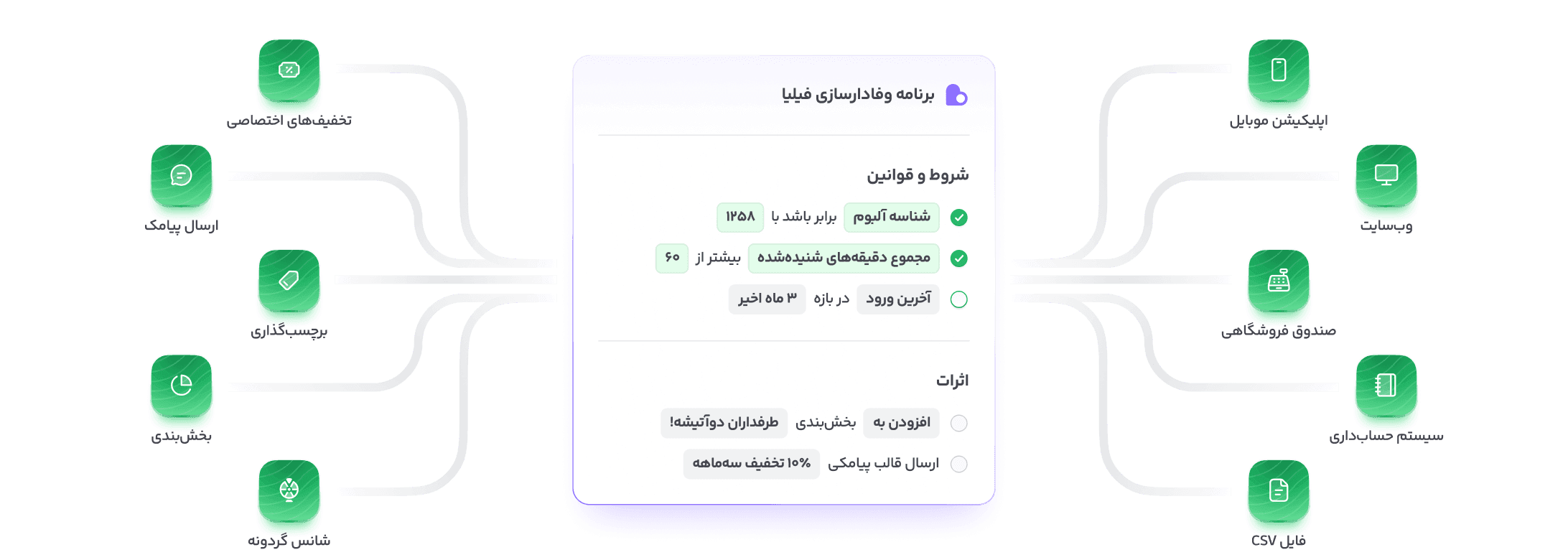 فیلیا بهعنوان هسته اصلی وفاداری شما، تمام نقاط تماس با مشتری را در یک بستر واحد گرد هم میآورد. این یکپارچگی باعث میشود برنامهی وفاداریتان در همهی کانالها بهصورت یکدست اجرا شود.